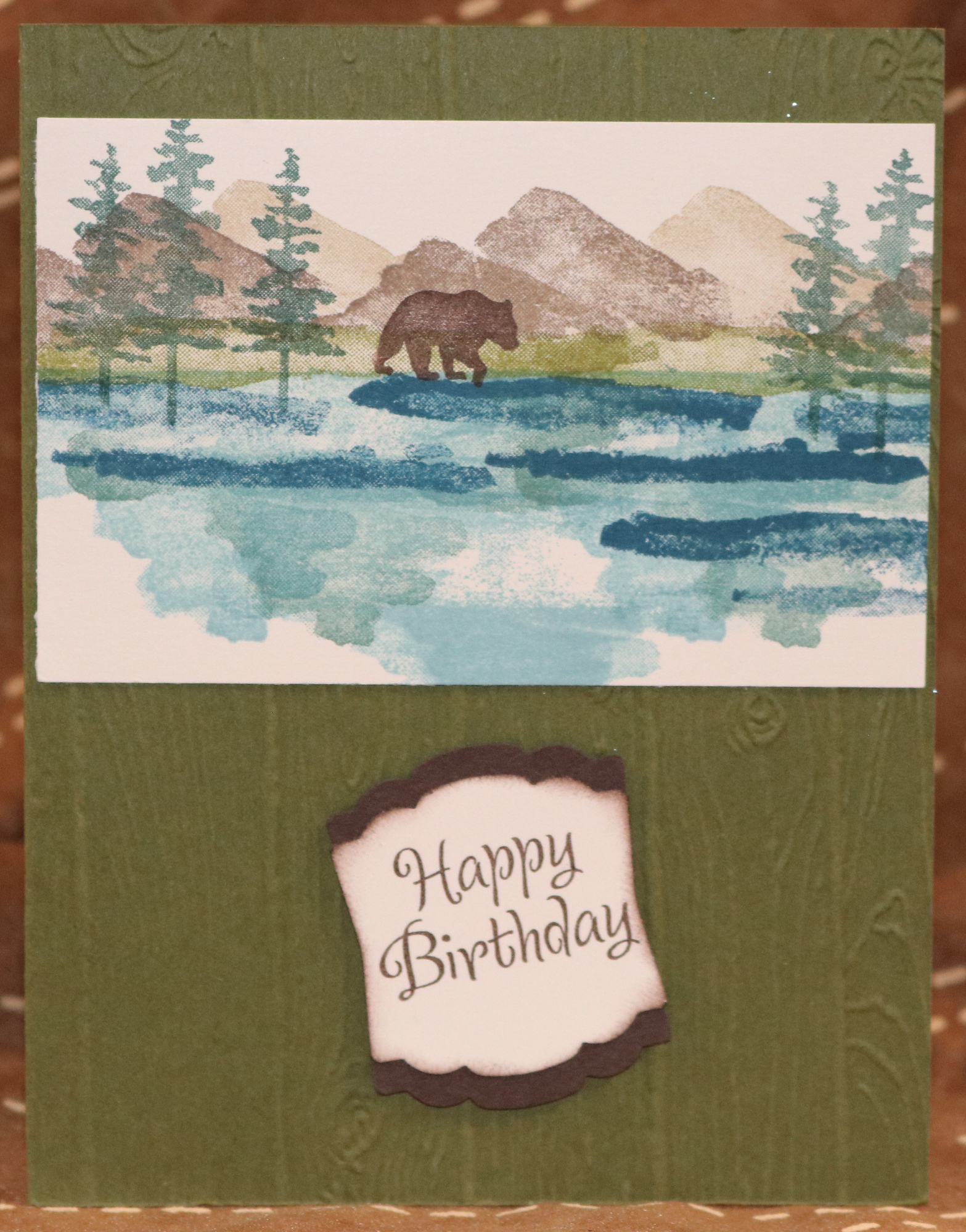 Green, Vanilla, Brown Paper - Pinewood Planks Embossing Folder - Mountain, Trees, Waterfront with bear