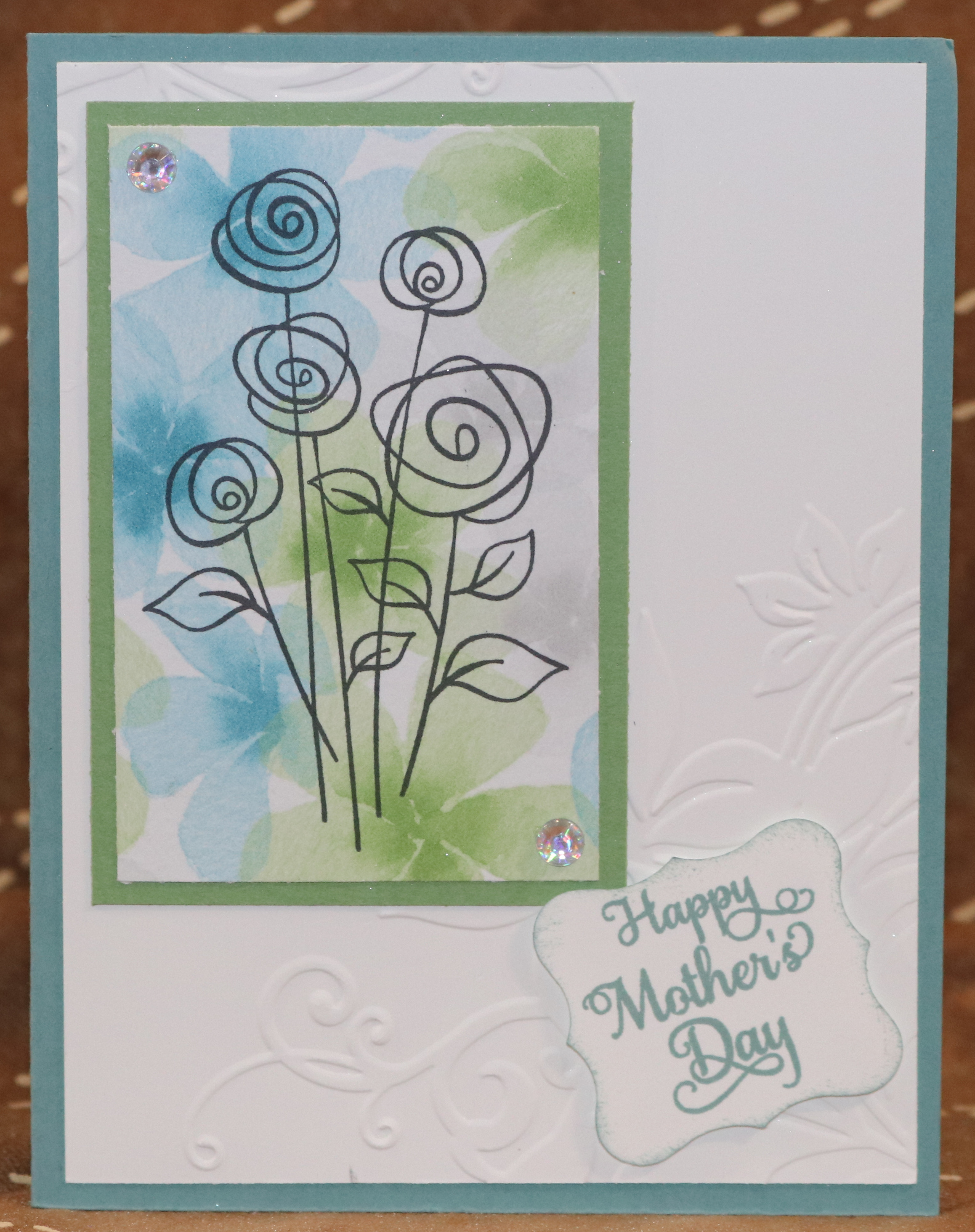 Blue Green, White Paper - Corner Florals Embossing Folder - Watercolor DSP with with Doodle Rose, Rhinestones