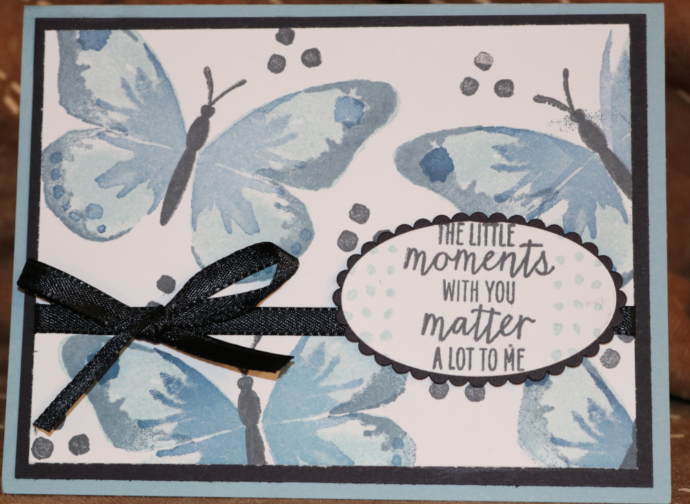 Blue, Black, White Papers - Watercolor Wings 3 step stamping, black ribbon
