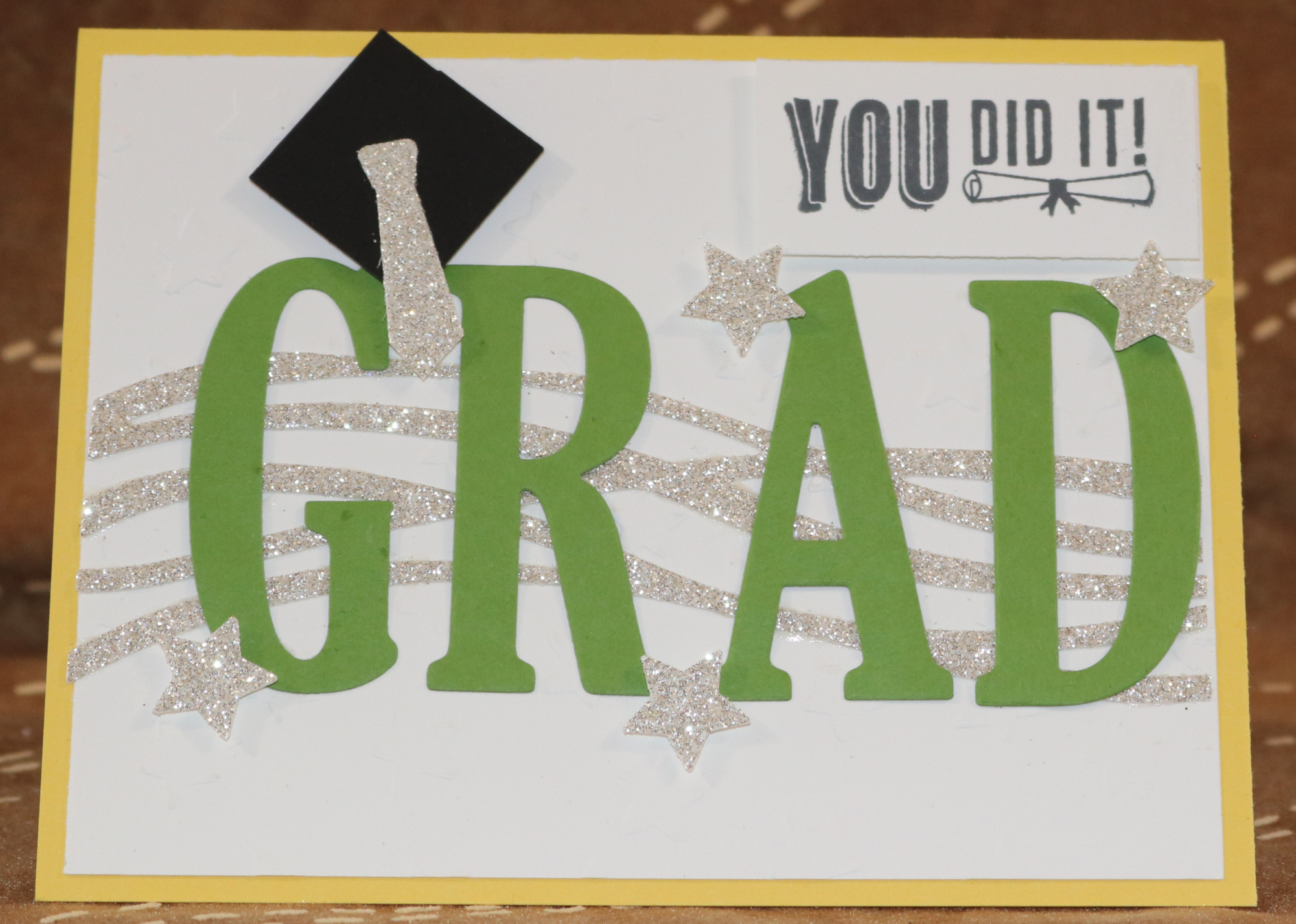 Yellow, Green, Black, Silver Glitter, White Paper - Star Embossing Folder - Silver Glitter Waves - Green GRAD Letters, Stars, Hat with Tassel