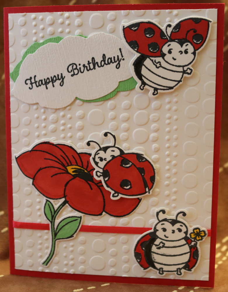 Red, White, Green Papers - Cute colored ladybugs on flowers and flying around, polka dots embossing folder, red ribbon