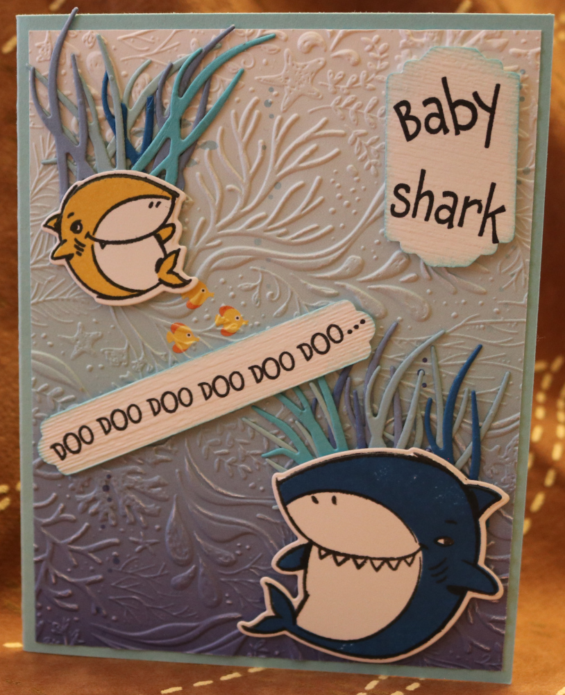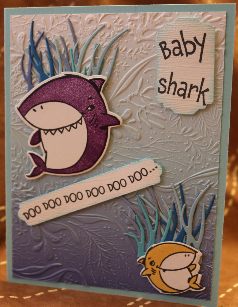 Blue, White, Assorted Blues and Greens, Underwater DSP Papers - Sea grasses Embossing Folder - Baby Shark Stamp - Sea grasses in asst colors