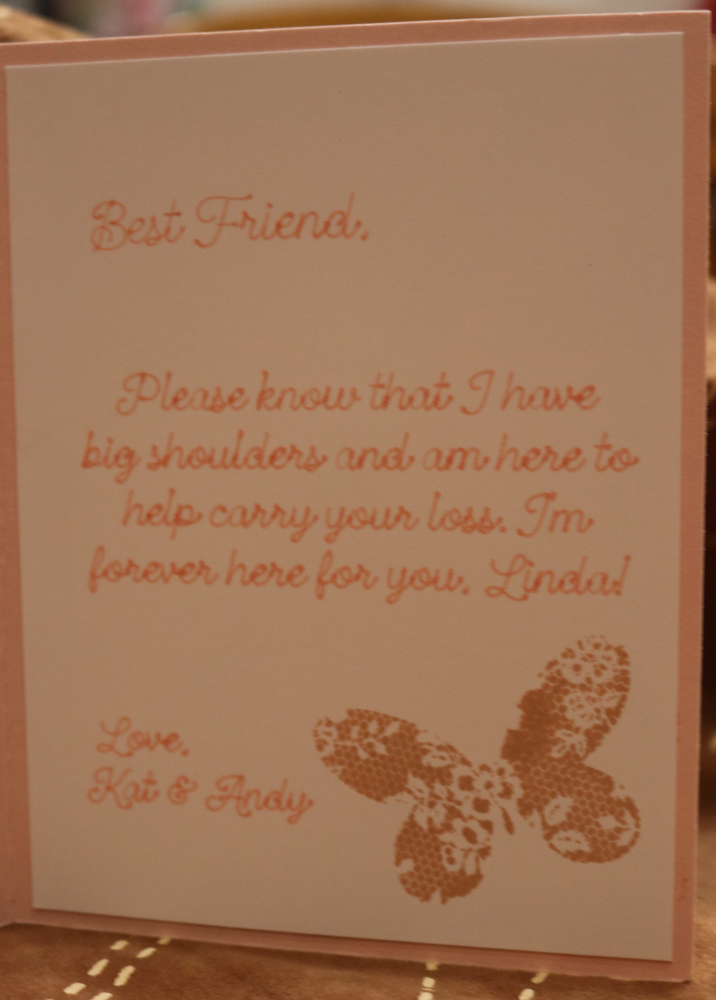 Inside Words - Best Friend, Please know that I have big shoulders and am here to help carry your loss. I'm forever here for you, Linda! Love Kat & Andy, butterfly in corner