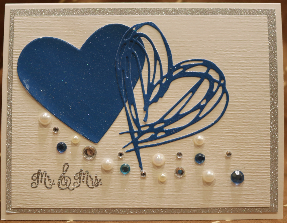 White, Silver Glitter, Blue Shimmer Paper - Subtle Embossing Folder - Double Hearts with asst rhinestones and pearls