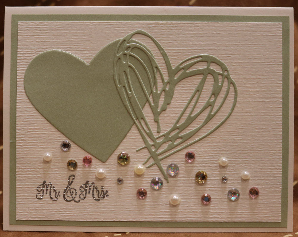 White, Sage Shimmer Paper - Subtle Embossing Folder - Double Hearts with asst rhinestones and pearls