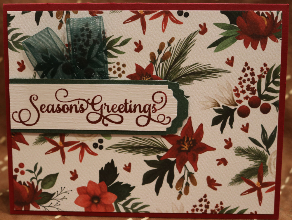Dark Red, White, Dark Green Shimmer, White Background with Red Poinsettia and White Christmas Flowers DSP Papers - Subtle Embossing Folder - 2 loops of Ribbon behind the words
