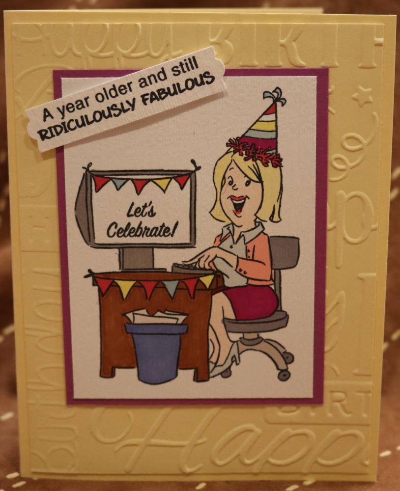 Light Yellow, Magenta and White Papers - Happy Birthday and Subtle Embossing Folder - Girlfriend at her desk