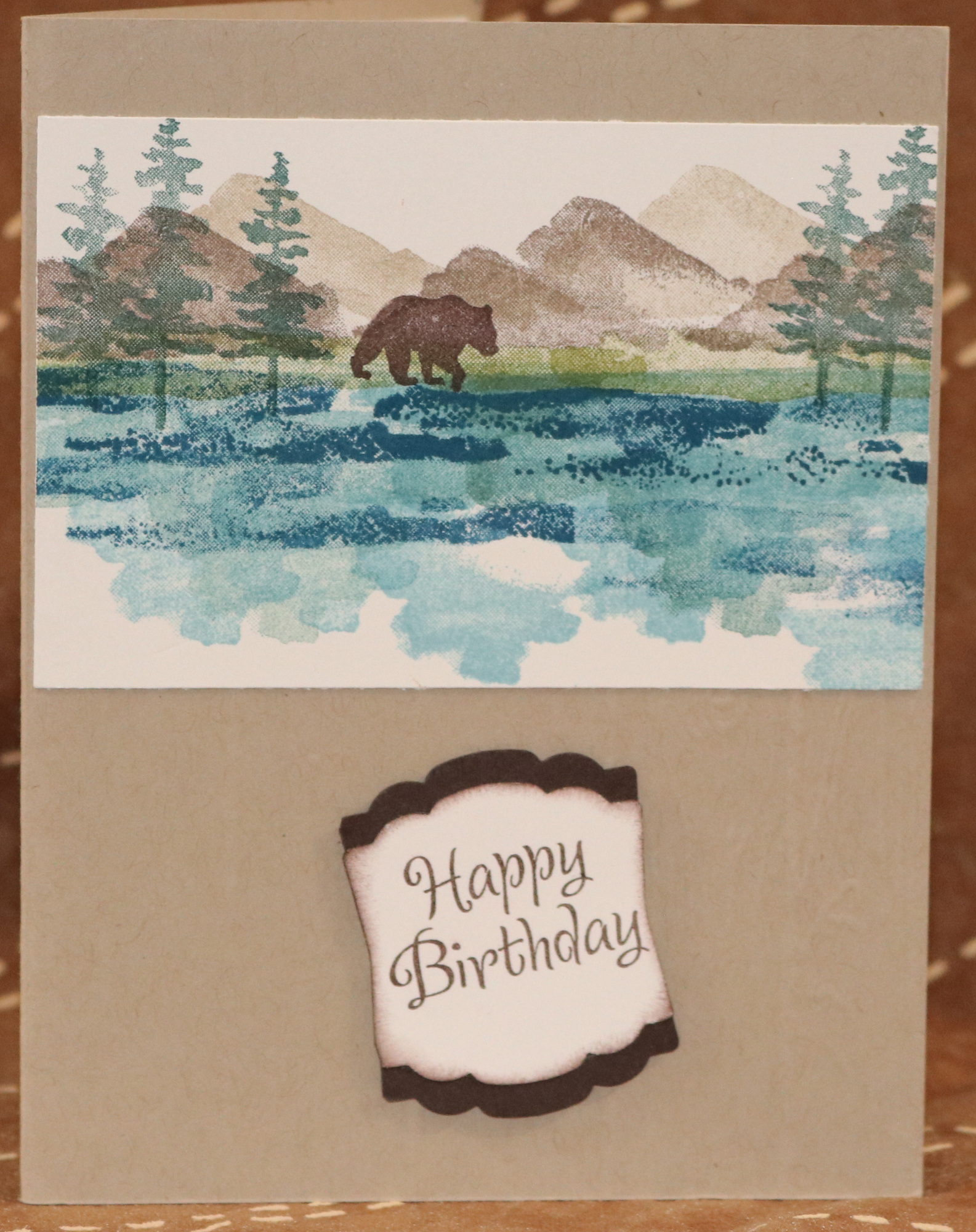 Beige, Vanilla, Brown Papers - Wood Plank Embossing Folder - Mountain, Trees, Waterfront with bear