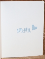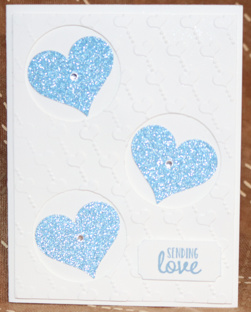 White, Blue Glitter Paper - Diagonal Heart Embossing Folders - 3 circle cut outs with blue glitter hearts and rhinestones