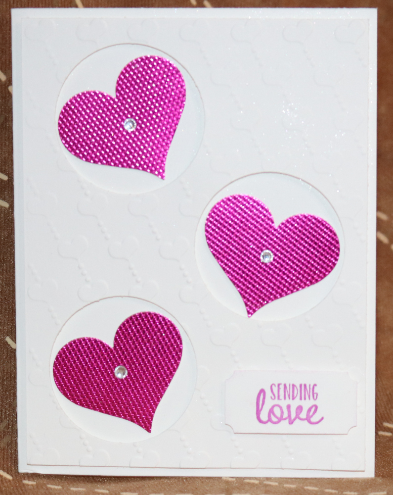 White, Pink Shiny Textured Paper - Diagonal Heart Embossing Folders - 3 circle cut outs with Pink Shiny Textured hearts and rhinestones