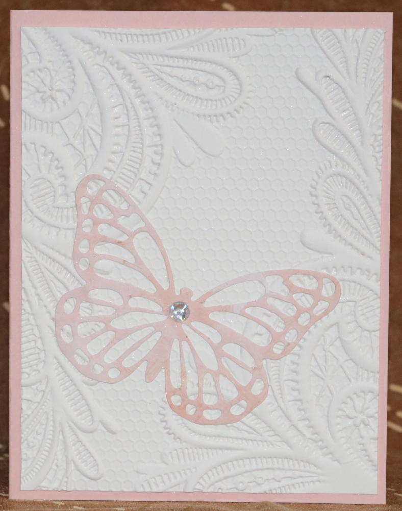Pink, White, Pink DSP Papers - Ornate Lace Embossing Folder with Butterfly Die Cut and Rhinestones