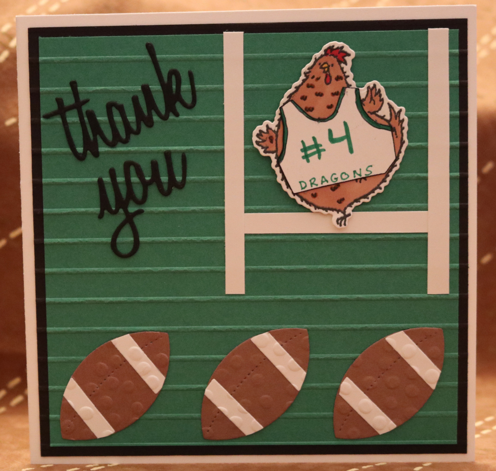 White, Green, Black and Brown Papers - Goal Post with a Chicken and Footballs on turf