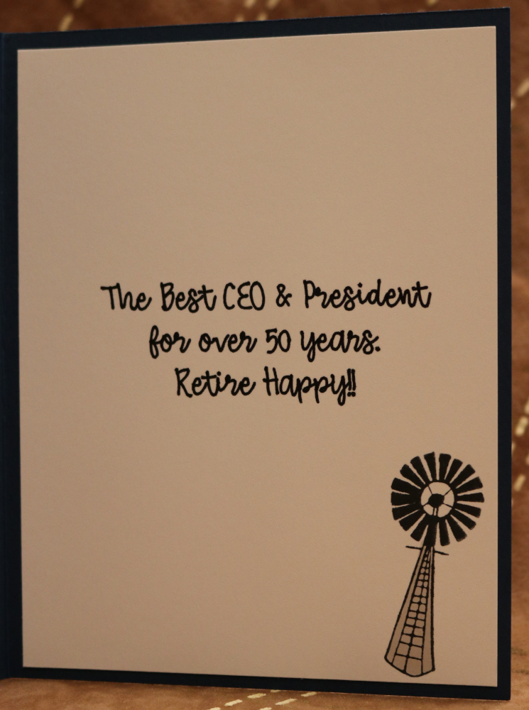 Inside Words - the Best CEO & President for over 50 years. Retire Happy, windwill in corner