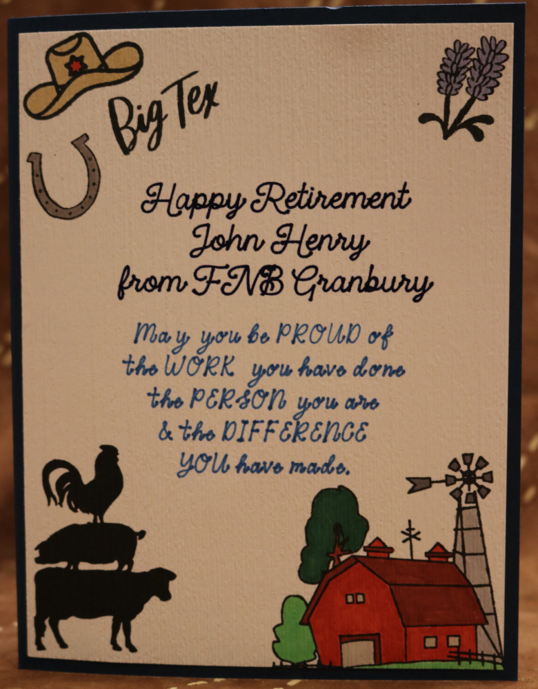 Front Words - Big Tex, Happy Retirement John Henry from FNB Granbury May you be PROUD of the WORK you have done the PERSON you are & the DIFFERENCE YOU have made.