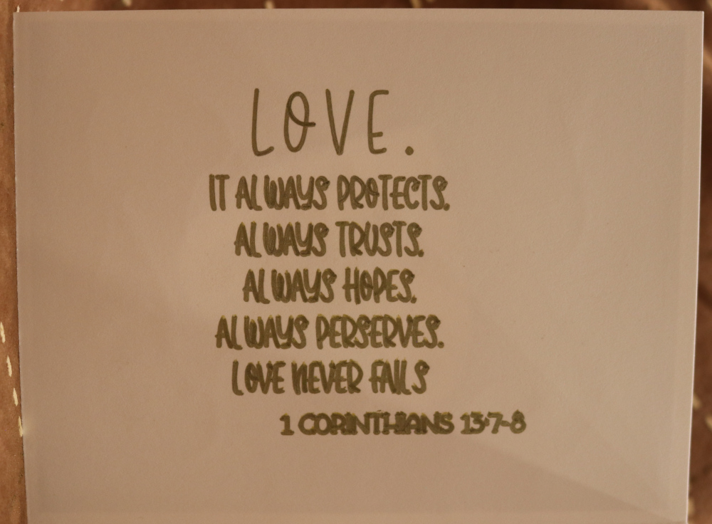 Inside Words - Opposite Page - LOVE. It always protects, always trusts, always hopes, always preserves. Love never fails 1 Corinthians 13:7-8 on opposite page