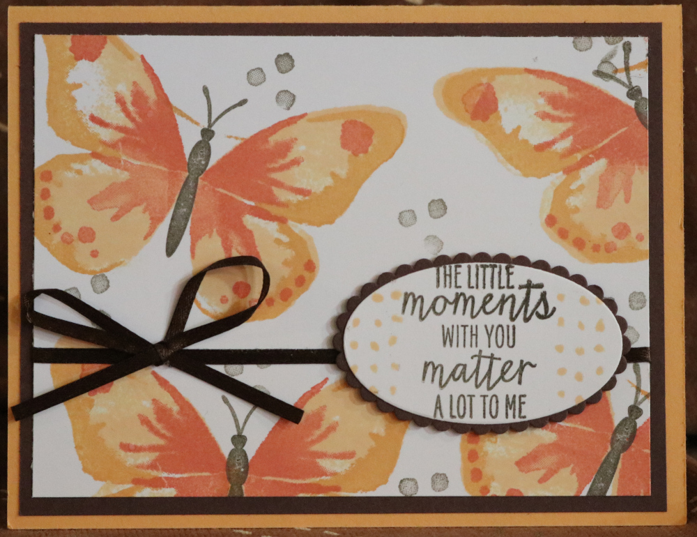 Peach, Brown, White Papers - Watercolor Wings 3 step stamping, brown ribbon