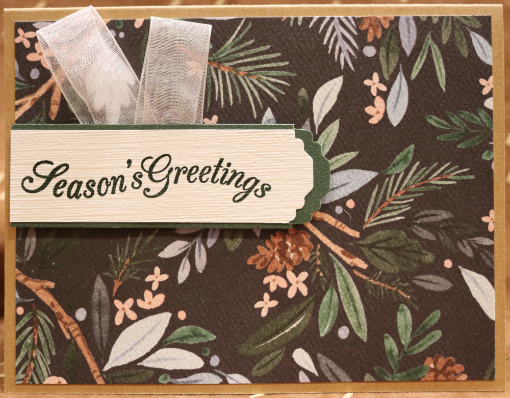 Tan, White, Dark Green Shimmer, Dark Blue Background with Winter Floral and Pinecones DSP Papers - Subtle Embossing Folder - 2 loops of Ribbon behind the words