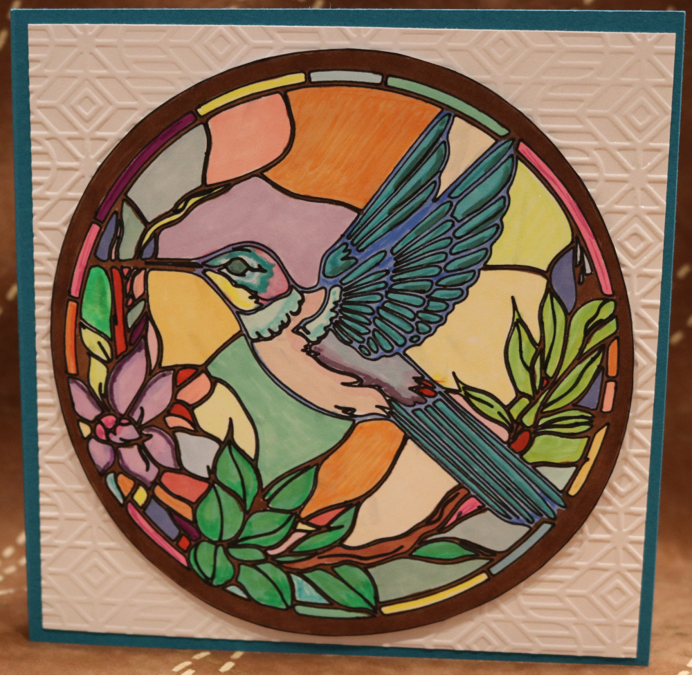 Blue and White Papers - Deco Holiday Embossing Folder - Stained Glass Hummingbird colored with markers